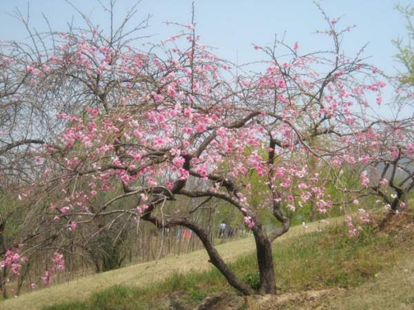 垂枝桃是桃花中枝姿最具韻味的一個類型,其小枝拱形下垂,樹冠猶如傘蓋。花開時節(jié),宛如花簾一瀉而下,蔚為壯觀。無論是孤植于庭院,還是群植,都有很好的觀賞效果,可作為公園、小區(qū)等地的景觀樹或行道樹
