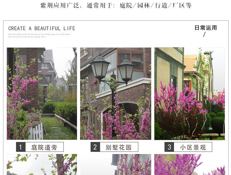 叢生紫荊先花后葉,花形如蝶,滿樹皆紅,艷麗可愛,葉片心形,多叢植于草坪邊緣和建筑物旁,園路角隅或樹林邊緣。因開花時,葉尚未發出,故宜與常綠之松柏配植為前景或植于淺色的物體前面,如白粉墻之前或巖石旁。