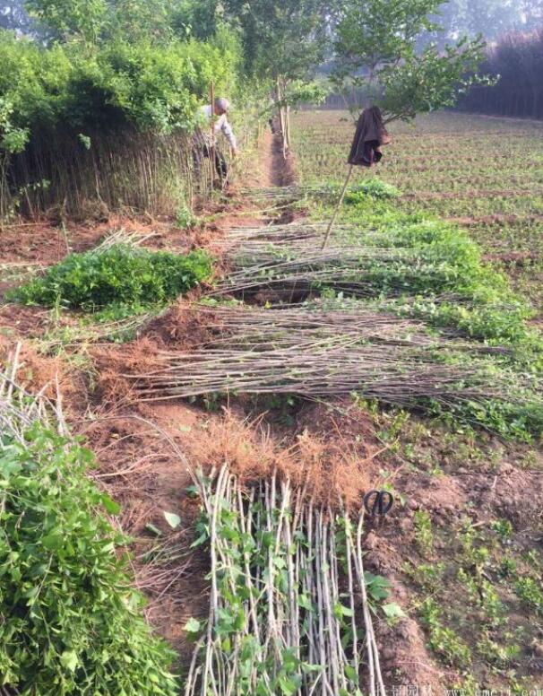 木槿樹苗有扦插繁殖、芽貼、田間種植、分株等方法,我們苗圃基地使用的是扦插繁殖方式;定桿高度分栽:如需要1.5米的開叉,則需要定桿1.2米,如1.4米開叉,則定桿高度為1.5米;為保證主桿通直,樹苗的首次分栽距離我們是55*120,留下空間可以長至3~4.5公分,就需要第二次分栽。一棵優質的樹苗,需要好的管理方式,木槿需要修整3次以上的冠形,我們選在2月下旬長葉前,把冠形修整預留18~25公分的茬,因而就發出很多的開叉,冠形更合格。