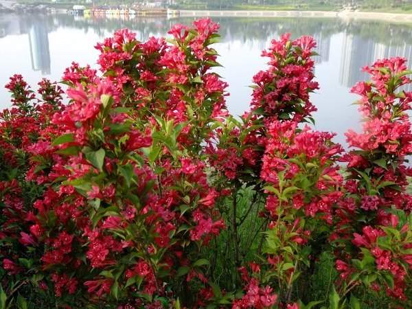 紅王子錦帶花,花色艷麗繁茂,開(kāi)花時(shí)分紅綠相間,而且能在河畔潮濕環(huán)境中生長(zhǎng)良好,是非常好的河畔觀賞植物。